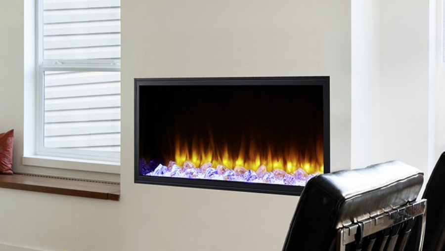 The SimpliFire Scion fireplace provides the warmth and coziness of a fireplace without the need for gas lines or venting. Elevated style shines through with the sleek and modern design – no mesh screens or visible heat vents, a multitude of flame and ember bed lighting themes, and the ability to bring finishing materials right up to the edge of the fireplace for a flush look.
