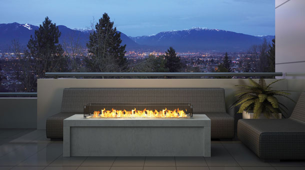 For an incredible dramatic effect, you can connect two Plateau outdoor gas burners to make an impressive 60” linear gas fireplace.